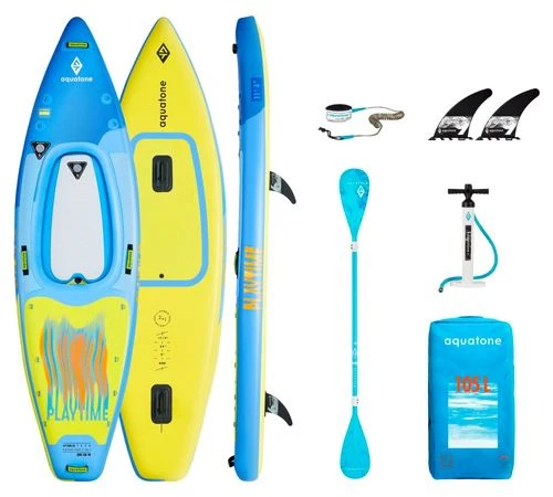 The Playtime sitin Kayak from Aquatone is an incredibly versatile you can in fact sup and kayak with this inflatable board, perfect for a great time on the water. The sup/kayak is ideal for beginner and intermediate paddlers. Because the sup / kayak is inflatable, it is very easy to carry in the car and on trips.